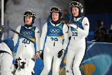 Silje OPSETH, NOR, Bib number 33, Anna Odine STROEM, NOR, Bib number 47, Heidi Dyhre TRAASERUD, NOR, Bib number 40, Action Photo, Women's Large Hill HS141 at Ski Jumping Olympic Winter Games 2025-26 in Milano Cortina, Italy, 2026-02-15, Photo Credit: action press / Yohei Osada / KarmaPress - AGENZIA ALDO LIVERANI SAS ITALY ONLY EDITORIAL USE ONLY