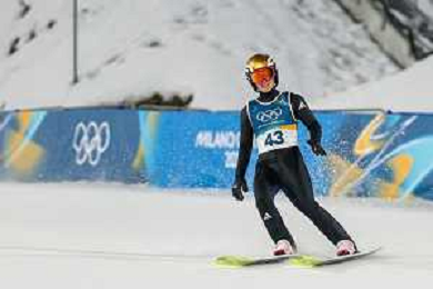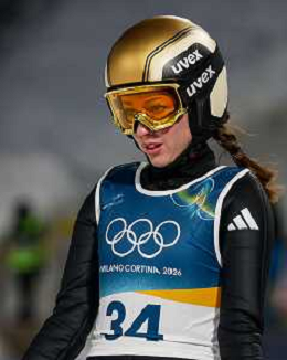 Meghann WADSAK, AUT, Bib number 9, Run 1, Action Photo, Women's Large Hill HS141 at Ski Jumping Olympic Winter Games 2025-26 in Milano Cortina, Italy, 2026-02-15, Photo Credit: action press / Julia Piatkowska / KarmaPress - AGENZIA ALDO LIVERANI SAS ITALY ONLY EDITORIAL USE ONLY