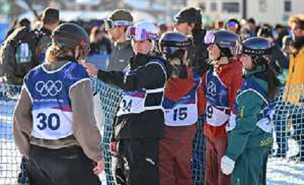 Hanna Karrer, AUT, Bib No: 30, Action Photo Lucia Georgalli, NZL, Bib No: 24, Action Photo Juliette Pelchat CAN, Bib No: 15 Action Photo Laurie Blouin, CAN, Bib No:9, Action Photo Ally Hickman, AUS, Bib No: 14, Action Photo, Women's Slopestyle Qualification at Snowboard Olympic Winter Games 2025-26 in Milano-Cortina, Italy, 2026-02-15, Photo Credit: action press / Christian Stadler / KarmaPress - AGENZIA ALDO LIVERANI SAS ITALY ONLY EDITORIAL USE ONLY