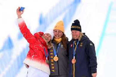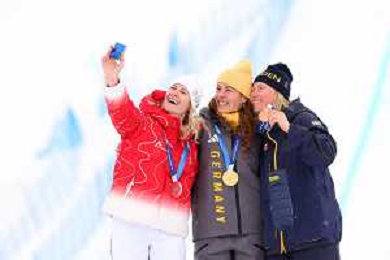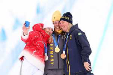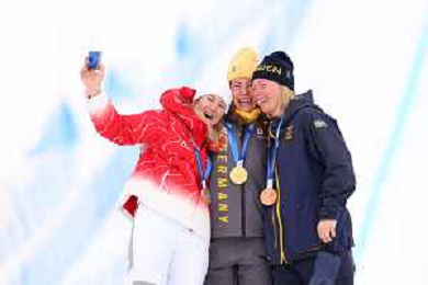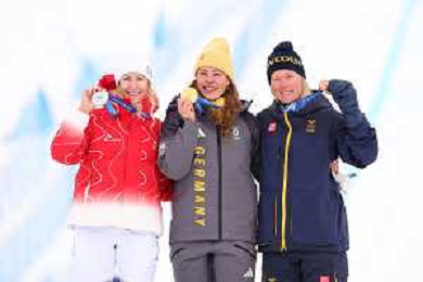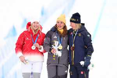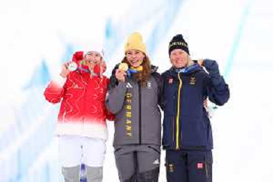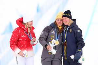 Daniela MAIER, GER, bib number 1, Podium Photo, Fanny SMITH, SUI, bib number 3, Podium Photo, Sandra NAESLUND, SWE, bib number 2, Podium Photo, , Women's Ski Cross at Freestyle Olympic Winter Games 2025-26 in Milano-Cortina, Italy, 2026-02-20, Photo Credit: action press / Naoki Morita /KarmaPress -AGENZIA ALDO LIVERANI SAS ITALY ONLY EDITORIAL USE ONLY