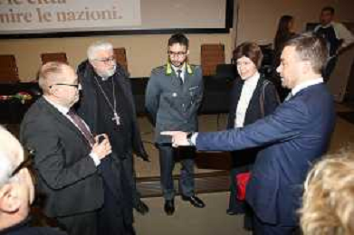 IMOLA 21 02 2026 CONVEGNO ‘Unire le citta’ per unire le nazioni. L’idea e la funzione della citta’ in Giorgio La Pira’ NELLA FOTO DA SINISTRA FABRIZIO CASTELLARI, VESCOVO DI IMOLA GIOVANNI MOSCIATTI, GIUSEPPE MARROCCO TENENTE DELLA GUARDIA DI FINANZA, Patrizia Giunti, Presidente della Fondazione Giorgio La Pira E SINDACO DI IMOLA MARCO PANIERI ©SANNA -AGENZIA ALDO LIVERANI SAS