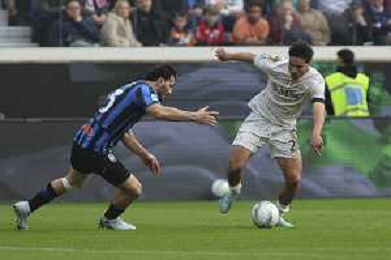 Alisson Santos of SSC Napoli competes for the ball with Raul Bellanova of Atalanta BC during Atalanta BC vs SSC Napoli, 26° Serie A Enilive 2025-26 game at New Balance arena in Bergamo (BG), Italy, on February 22, 2026. (Photo by Davide Casentini) -AGENZIA ALDO LIVERANI SAS