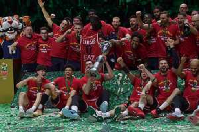 Torino 22.02.2026 Inalpi Arena @Manuela Viganti /Ag. Aldo Liverani sas EA7 Emporio Armani Milano vs Bertram Derthona Tortona Frecciarossa Finale Final Eight Basket 2026 Nella foto: i giocatori di milano festeggiano con la coppa ©Viganti -AGENZIA ALDO LIVERANI SAS