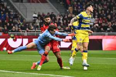Milan vs Parma nella foto Christian Mate Pulisic (Milan) occasione da gol respinta da Mariano Emir Troilo (Parma) Milano 22-02-2026 Stadio Giuseppe Meazza - San Siro Milan vs Parma Campionato Serie A Enilive - 26a giornata foto Roberto Garavaglia/Agenzia Aldo Liverani sas