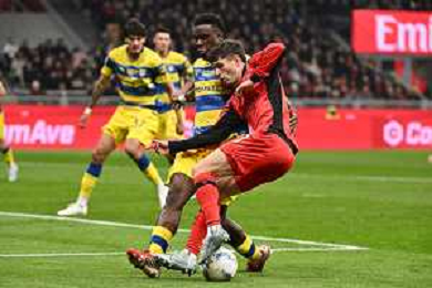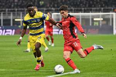 Milan vs Parma nella foto Lamine Mandela Keita (Parma) e Christian Mate Pulisic (Milan) Milano 22-02-2026 Stadio Giuseppe Meazza - San Siro Milan vs Parma Campionato Serie A Enilive - 26a giornata foto Roberto Garavaglia/Agenzia Aldo Liverani sas