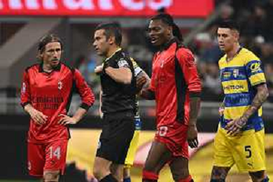 Milan vs Parma nella foto Rafael Leao (Milan)nprotesta coin l'arbitro Marco Piccinini di Forlì Milano 22-02-2026 Stadio Giuseppe Meazza - San Siro Milan vs Parma Campionato Serie A Enilive - 26a giornata foto Roberto Garavaglia/Agenzia Aldo Liverani sas