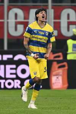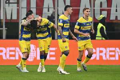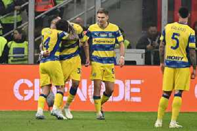 Milan vs Parma nella foto giocatori Parma esultanza dopo il gol dell'1 a 0 Milano 22-02-2026 Stadio Giuseppe Meazza - San Siro Milan vs Parma Campionato Serie A Enilive - 26a giornata foto Roberto Garavaglia/Agenzia Aldo Liverani sas