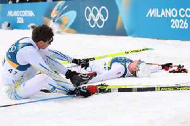 Daniel PESHKOV, BUL, bib number 56, Dmytro DRAHUN, UKR, bib number 54, action photo, Men's 50km Mass Start Classic at Cross-Country Olympic Winter Games 2025-26 in Milano Cortina, Italy, 2026-02-21, Photo Credit: action press / Julia Piatkowska / KarmaPress -AGENZIA ALDO LIVERANI SAS - ITALY ONLY EDITORIAL USE ONLY