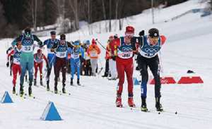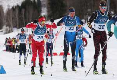 Florian NOTZ, GER, bib number 15, Antoine CYR, CAN, bib number 19, Gus SCHUMACHER, USA, bib number 5, action photo, Men's 50km Mass Start Classic at Cross-Country Olympic Winter Games 2025-26 in Milano Cortina, Italy, 2026-02-21, Photo Credit: action press / Julia Piatkowska / KarmaPress -AGENZIA ALDO LIVERANI SAS - ITALY ONLY EDITORIAL USE ONLY