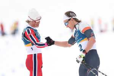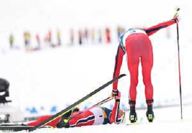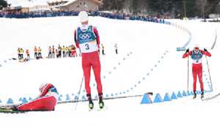Johannes Hoesflot KLAEBO, NOR, bib number 1, Savelii KOROSTELEV, AIN, bib number 12, action photo, Men's 50km Mass Start Classic at Cross-Country Olympic Winter Games 2025-26 in Milano Cortina, Italy, 2026-02-21, Photo Credit: action press / Julia Piatkowska / KarmaPress -AGENZIA ALDO LIVERANI SAS - ITALY ONLY EDITORIAL USE ONLY