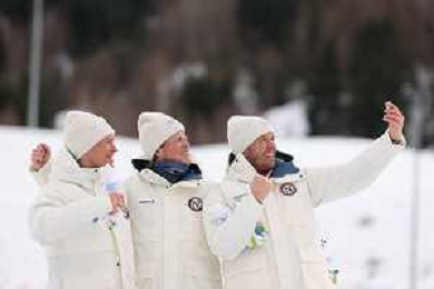Martin Loewstroem NYENGET, NOR, Emil IVERSEN, NOR, Johannes Hoesflot KLAEBO, NOR, and team Norway, winner photo, Men's 50km Mass Start Classic at Cross-Country Olympic Winter Games 2025-26 in Milano Cortina, Italy, 2026-02-21, Photo Credit: action press / Julia Piatkowska / KarmaPress -AGENZIA ALDO LIVERANI SAS - ITALY ONLY EDITORIAL USE ONLY