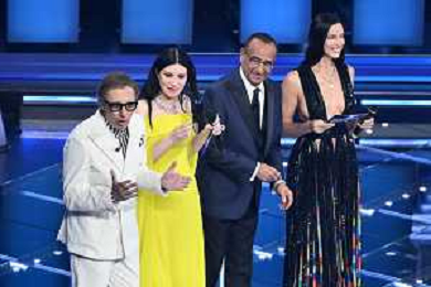Festival Sanremo 2026 nella foto da SX Ubaldo Pantani, Laura Pausini, Carlo Conti e Irina Shayk Sanremo (IM) 26-02-2026 Teatro Ariston 76mo Festival della Canzone Italiana - Terza Serata foto Roberto Garavaglia/agenzia Aldo Liverani sas