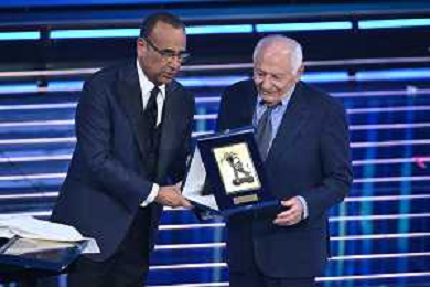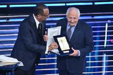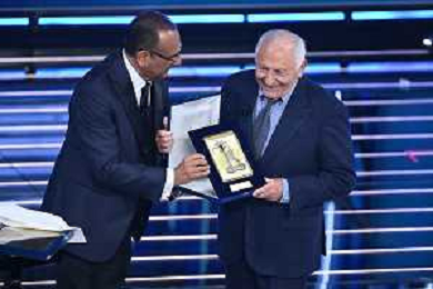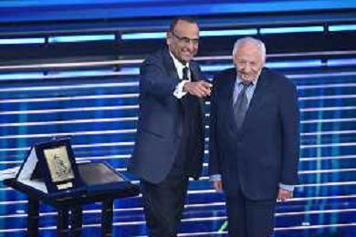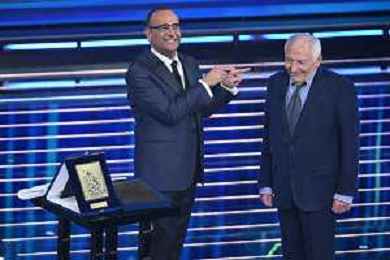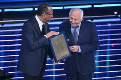 Festival Sanremo 2026 nella foto Carlo Conti consegna il premio alla carriera a Giulio Rapetti Mogol Sanremo (IM) 26-02-2026 Teatro Ariston 76mo Festival della Canzone Italiana - Terza Serata foto Roberto Garavaglia/agenzia Aldo Liverani sas