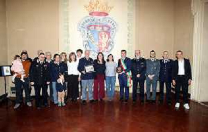 IMOLA 28 02 2026 saluto del Sindaco MARCO PANIERI per il pensionamento di Vittorio Neri, comandante distaccamento polizia stradale di Imola. NELLA FOTO VITTORIO NERI , SINDACO MARCO PANIERI,FAMIGLIA DI VITTORIO NERI, STEFANO MIRRI COMUNE, POLIZIA STRADALE, CARABINIERI GUARDIE DI FINANZA, POLIZIA DI STATO ©SANNA-AGENZIA ALDO LIVERANI SAS