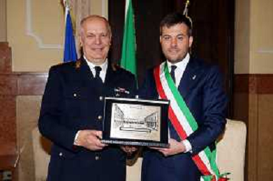 IMOLA 28 02 2026 saluto del Sindaco MARCO PANIERI per il pensionamento di Vittorio Neri, comandante distaccamento polizia stradale di Imola. NELLA FOTO VITTORIO NERI E SINDACO MARCO PANIERI ©SANNA-AGENZIA ALDO LIVERANI SAS