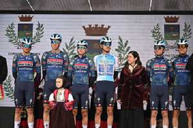 01-03-2026 Giro Di Sardegna; Tappa 05 Nuoro - Olbia; 2026, Soudal - Quick Step; Zana, Filippo; Aru, Fabio; Pella, Roberto; Todde, Alessandra; Olbia; ©SIROTTI-AGENZIA ALDO LIVERANI SAS