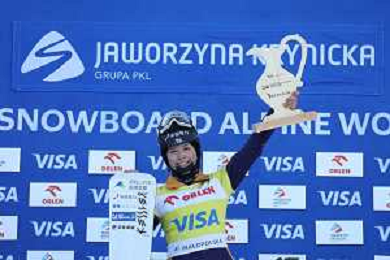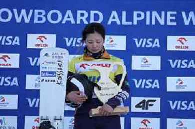 Tsubaki MIKI, JPN, bib number 1, podium photo, Women's Parallel Giant Slalom at Visa FIS Snowboard Alpine World Cup 2025-26 in Krynica, Poland, 2026-02-28, Photo Credit: action press / Miha Matavz ag karmapress-ag aldo liverani sas-only italy