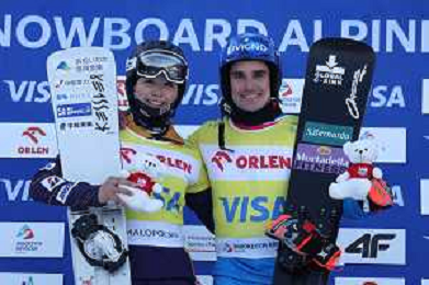 Tsubaki MIKI, JPN, bib number 1, Maurizio BORMOLINI, ITA, bib number 1, winner photo, Women's Parallel Giant Slalom at Visa FIS Snowboard Alpine World Cup 2025-26 in Krynica, Poland, 2026-02-28, Photo Credit: action press / Miha Matavz ag karmapress-ag aldo liverani sas-only italy