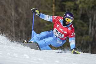 Sangkyum KIM, KOR, bib number 35, Action Photo, Men's Parallel Giant Slalom Qualification at Visa FIS Snowboard Alpine World Cup 2025-26 in Krynica, Poland, 2026-03-01, Photo Credit: action press / Miha Matavz