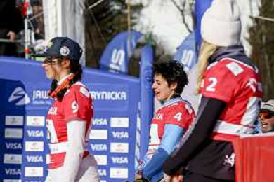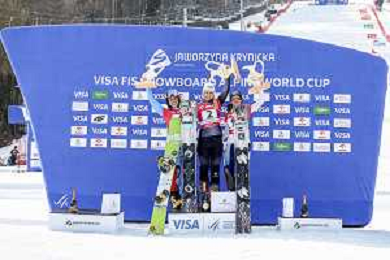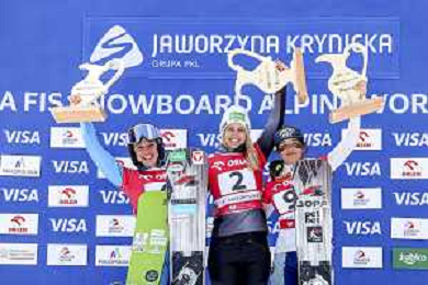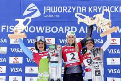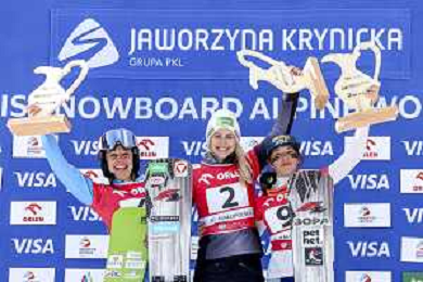 Sabine PAYER, AUT, bib number 2, Podium Photo, Women's Parallel Giant Slalom at Visa FIS Snowboard Alpine World Cup 2025-26 in Krynica, Poland, 2026-03-01, Photo Credit: action press / Miha Matavz