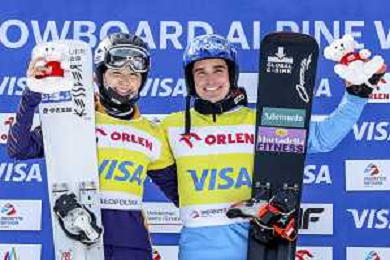 Tsubaki MIKI, JPN, bib number 1, Maurizio BORMOLINI, ITA, bib number 2, Podium Photo, Women's Parallel Giant Slalom at Visa FIS Snowboard Alpine World Cup 2025-26 in Krynica, Poland, 2026-03-01, Photo Credit: action press / Miha Matavz