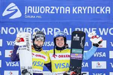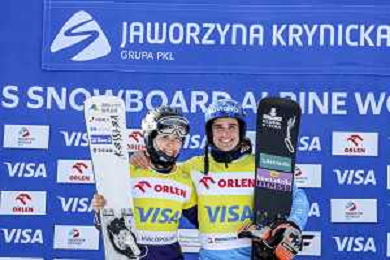 Lucia DALMASSO, ITA, bib number 4, Maurizio BORMOLINI, ITA, bib number 2, Podium Photo, Men's Parallel Giant Slalom at Visa FIS Snowboard Alpine World Cup 2025-26 in Krynica, Poland, 2026-03-01, Photo Credit: action press / Miha Matavz