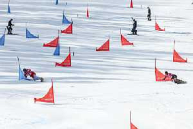Dario CAVIEZEL, SUI, bib number 4, Arnaud GAUDET, CAN, bib number 12, Action Photo, Men's Parallel Giant Slalom at Visa FIS Snowboard Alpine World Cup 2025-26 in Krynica, Poland, 2026-03-01, Photo Credit: action press / Miha Matavz