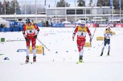 Andreas Fjorden REE, NOR, bib number 4, Johannes Hoesflot KLAEBO, NOR, bib number 1, Martin Loewstroem NYENGET, NOR, bib number 3, action photo, Men's 20km Skiathlon Classic/Free at Coop FIS Cross-Country World Cup 2025-26 in Falun, Sweden, 2026-03-01, Photo Credit: action press / Jonathan Nackstrand/ KarmaPress - AGENZIA ALDO LIVERANI SAS ITALY ONLY EDITORIAL USE ONLY