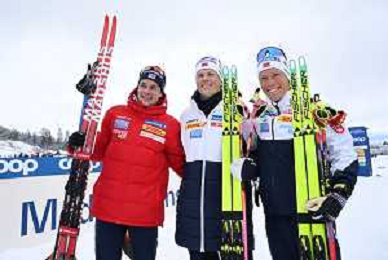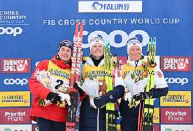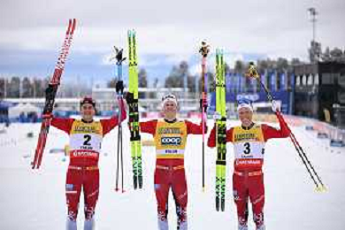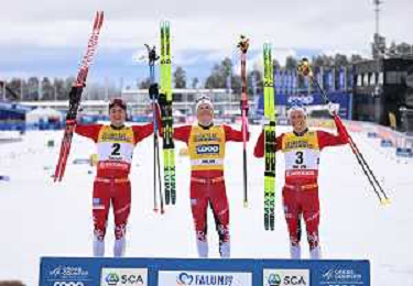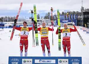 Harald Oestberg AMUNDSEN, NOR, bib number 2, Martin Loewstroem NYENGET, NOR, bib number 3, Johannes Hoesflot KLAEBO, NOR, bib number 1, winner photo, Men's 20km Skiathlon Classic/Free at Coop FIS Cross-Country World Cup 2025-26 in Falun, Sweden, 2026-03-01, Photo Credit: action press / Jonathan Nackstrand/ KarmaPress - AGENZIA ALDO LIVERANI SAS ITALY ONLY EDITORIAL USE ONLY