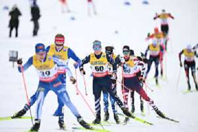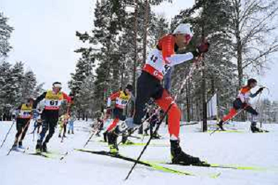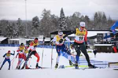 Olivier LEVEILLE, CAN, bib number 43, Alexander STAHLBERG, FIN, bib number 59, Cyril FAEHNDRICH, SUI, bib number 51, Kevin BOLGER, USA, bib number 49, action photo, Men's 20km Skiathlon Classic/Free at Coop FIS Cross-Country World Cup 2025-26 in Falun, Sweden, 2026-03-01, Photo Credit: action press / Jonathan Nackstrand/ KarmaPress - AGENZIA ALDO LIVERANI SAS ITALY ONLY EDITORIAL USE ONLY