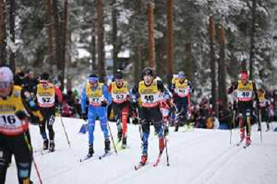 Alexander MATHISEN, SWE, bib number 65, Mike OPHOFF, CZE, bib number 61, Sasha MASSON, CAN, bib number 69, Olivier LEVEILLE, CAN, bib number 43, Max HOLLMANN, CAN, bib number 53, action photo, Men's 20km Skiathlon Classic/Free at Coop FIS Cross-Country World Cup 2025-26 in Falun, Sweden, 2026-03-01, Photo Credit: action press / Jonathan Nackstrand/ KarmaPress - AGENZIA ALDO LIVERANI SAS ITALY ONLY EDITORIAL USE ONLY