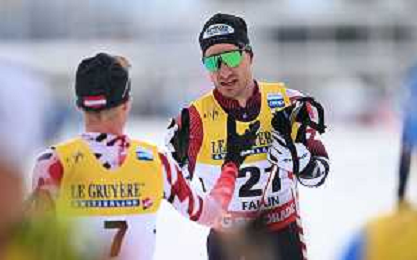 Mika VERMEULEN, AUT, bib number 7, Benjamin MOSER, AUT, bib number 21, action photo, Men's 20km Skiathlon Classic/Free at Coop FIS Cross-Country World Cup 2025-26 in Falun, Sweden, 2026-03-01, Photo Credit: action press / Jonathan Nackstrand/ KarmaPress - AGENZIA ALDO LIVERANI SAS ITALY ONLY EDITORIAL USE ONLY