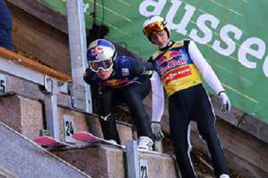 Ryoyu KOBAYASHI, JPN, bib number 55, Domen PREVC, SLO, bib number 56, training, action photo, Men's Flying Hill HS235 Qualification at Viessmann FIS Ski Jumping World Cup 2025-26 in Kulm, Austria, 2026-02-27, Photo Credit: action press / Julia Piatkowska ag karmapress-ag aldo liverani sas-only italy