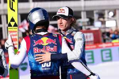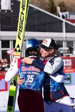 Stephan EMBACHER, AUT, bib number 35, run 2, Daniel TSCHOFENIG, AUT, bib number 38, run 2, action photo, Men's Flying Hill HS235 at Viessmann FIS Ski Jumping World Cup 2025-26 in Kulm, Austria, 2026-02-28, Photo Credit: action press / Julia Piatkowska ag karmapress-ag aldo liverani sas-only italy