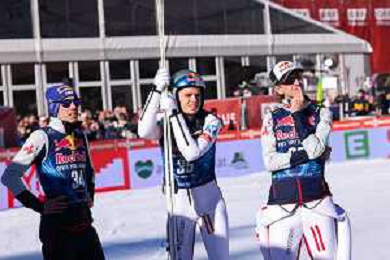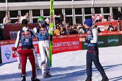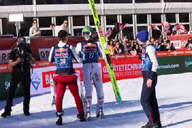 Stefan KRAFT, AUT, bib number 34, run 2, Stephan EMBACHER, AUT, bib number 35, run 2, Daniel TSCHOFENIG, AUT, bib number 38, run 2, action photo, Men's Flying Hill HS235 at Viessmann FIS Ski Jumping World Cup 2025-26 in Kulm, Austria, 2026-02-28, Photo Credit: action press / Julia Piatkowska ag karmapress-ag aldo liverani sas-only italy