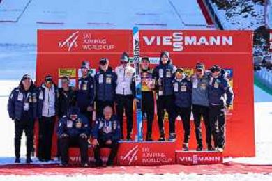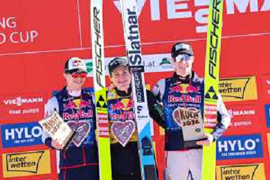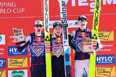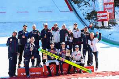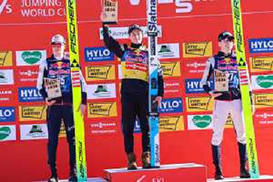 Stephan EMBACHER, AUT, bib number 35, Domen PREVC, SLO, bib number 40, Jonas SCHUSTER, AUT, bib number 27, podium photo, Men's Flying Hill HS235 at Viessmann FIS Ski Jumping World Cup 2025-26 in Kulm, Austria, 2026-02-28, Photo Credit: action press / Julia Piatkowska ag karmapress-ag aldo liverani sas-only italy