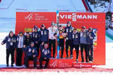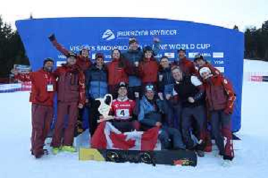 Team of Maurizio BORMOLINI, ITA, bib number 1, podium photo, Men's Parallel Giant Slalom at Visa FIS Snowboard Alpine World Cup 2025-26 in Krynica, Poland, 2026-02-28, Photo Credit: action press / Miha Matavz ag karmapress-ag aldo liverani sas-only italy