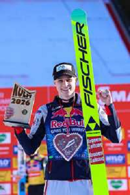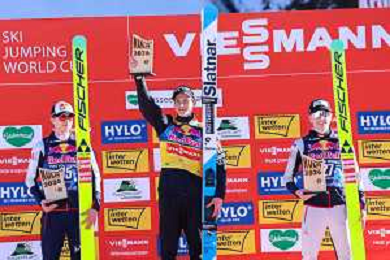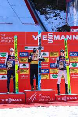 Jonas SCHUSTER, AUT, bib number 27, podium photo, Men's Flying Hill HS235 at Viessmann FIS Ski Jumping World Cup 2025-26 in Kulm, Austria, 2026-02-28, Photo Credit: action press / Julia Piatkowska ag karmapress-ag aldo liverani sas-only italy