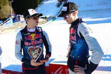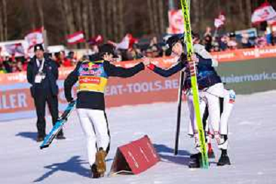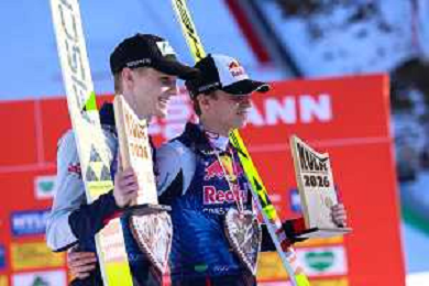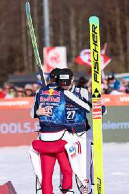 Domen PREVC, SLO, bib number 40, Jonas SCHUSTER, AUT, bib number 27, winner photo, Men's Flying Hill HS235 at Viessmann FIS Ski Jumping World Cup 2025-26 in Kulm, Austria, 2026-02-28, Photo Credit: action press / Julia Piatkowska ag karmapress-ag aldo liverani sas-only italy