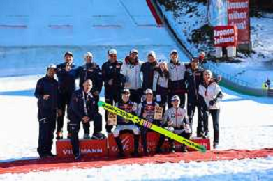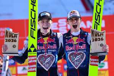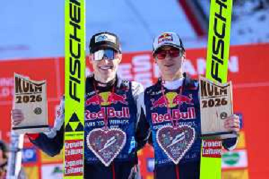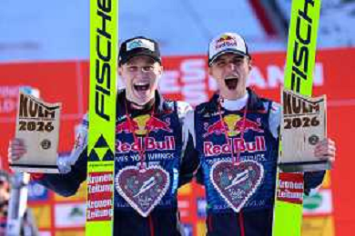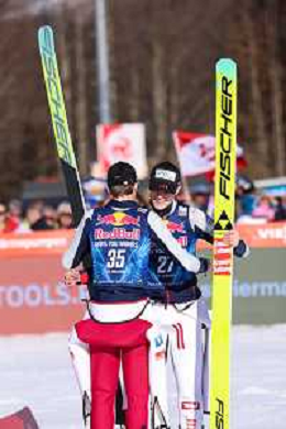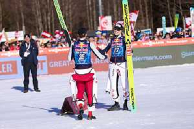 Stephan EMBACHER, AUT, bib number 35, Jonas SCHUSTER, AUT, bib number 27, winner photo, Men's Flying Hill HS235 at Viessmann FIS Ski Jumping World Cup 2025-26 in Kulm, Austria, 2026-02-28, Photo Credit: action press / Julia Piatkowska ag karmapress-ag aldo liverani sas-only italy