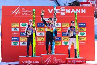 Domen PREVC, SLO, bib number 40, podium photo, Men's Flying Hill HS235 at Viessmann FIS Ski Jumping World Cup 2025-26 in Kulm, Austria, 2026-02-28, Photo Credit: action press / Julia Piatkowska ag karmapress-ag aldo liverani sas-only italy
