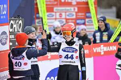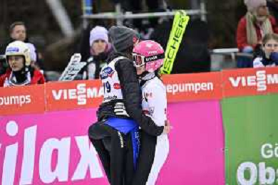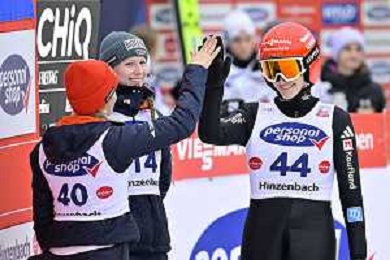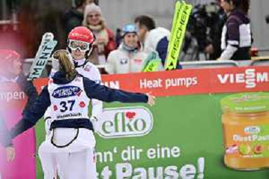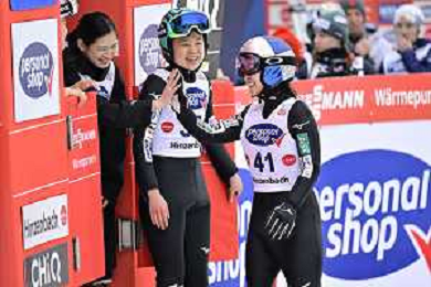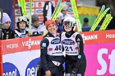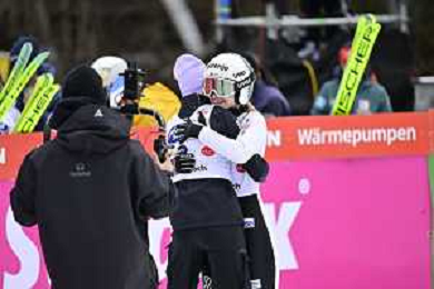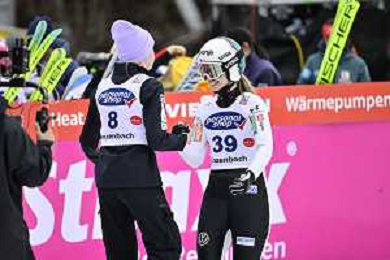 Katharina SCHMID, GER, bib number 40, Anna HOLLANDT, GER, bib number 21, Action Photo , Women's Normal Hill HS90 at Viessmann FIS Ski Jumping World Cup 2025-26 Hinzenbach, Austria, 2026-03-01, Photo Credit: action press / Dominik Berchtold/ KarmaPress - AGENZIA ALDO LIVERANI SAS ITALY ONLY EDITORIAL USE ONLY