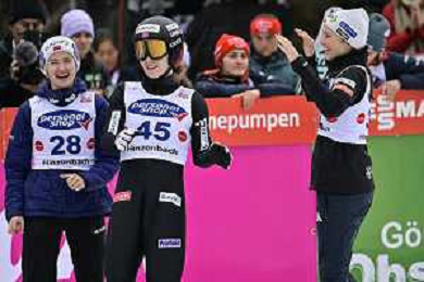 Katharina SCHMID, GER, bib number 40, Emely TORAZZA, GER, bib number 14, elina FREITAG, GER, bib number 44, Action Photo , Women's Normal Hill HS90 at Viessmann FIS Ski Jumping World Cup 2025-26 Hinzenbach, Austria, 2026-03-01, Photo Credit: action press / Dominik Berchtold/ KarmaPress - AGENZIA ALDO LIVERANI SAS ITALY ONLY EDITORIAL USE ONLY