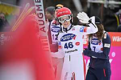 Lisa EDER, AUT, bib number 46, Podium Photo, Women's Normal Hill HS90 at Viessmann FIS Ski Jumping World Cup 2025-26 Hinzenbach, Austria, 2026-03-01, Photo Credit: action press / Dominik Berchtold/ KarmaPress - AGENZIA ALDO LIVERANI SAS ITALY ONLY EDITORIAL USE ONLY