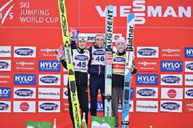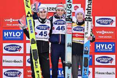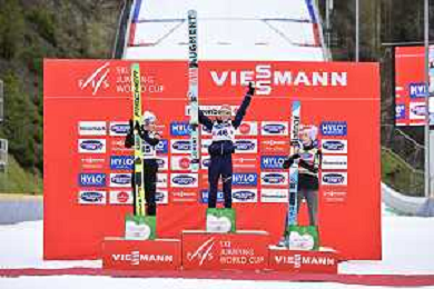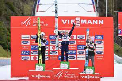 Anna Odine STROEM, NOR, bib number 45, Lisa EDER, AUT, bib number 46, Nika PREVC, SLO, bib number 48, Podium Photo, Women's Normal Hill HS90 at Viessmann FIS Ski Jumping World Cup 2025-26 Hinzenbach, Austria, 2026-03-01, Photo Credit: action press / Dominik Berchtold/ KarmaPress - AGENZIA ALDO LIVERANI SAS ITALY ONLY EDITORIAL USE ONLY