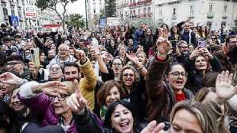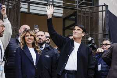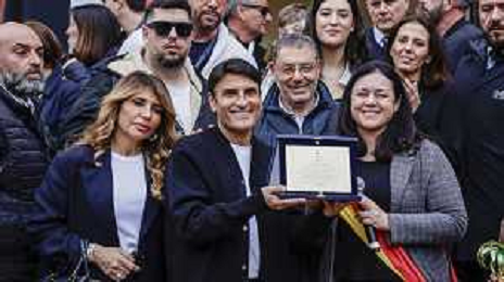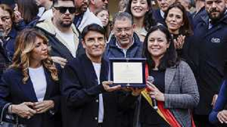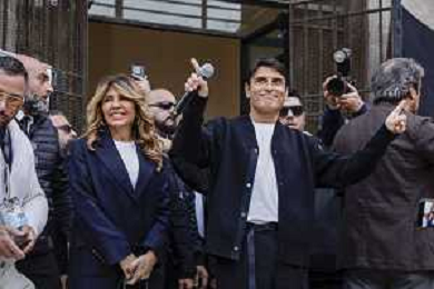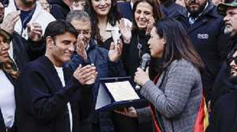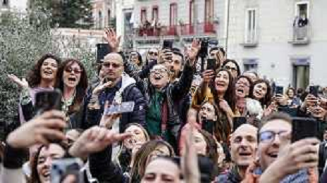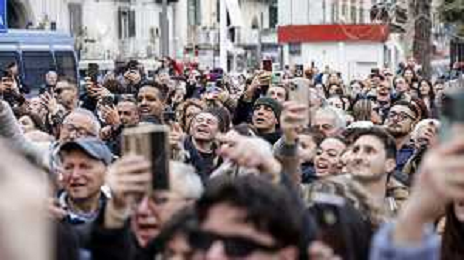 Sal Da Vinci torna a napoli dopo la vittoria di Sanremo - Napoli 05-03-2026 nella foto Sal Da Vinci, nel suo quartiere improvvisa un’esibizione in piazza davanti la gente del suo quartiere con la moglie Paola Pugliese. Foto Antonio Balasco - ag Aldo liverani
