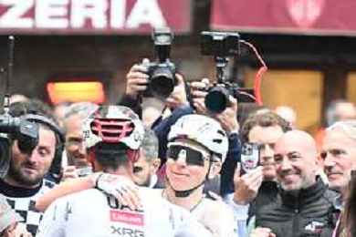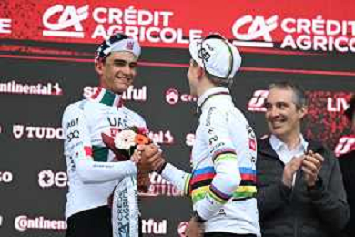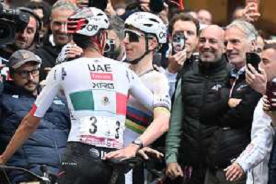 07-03-2026 Strade Bianche; 2026, Uae Emirates - Xrg; 2026, Decathlon - Cma Cgm; Pogacar, Tadej; Seixas, Paul; Siena; ©SIROTTI - AGENZIA ALDO LIVERANI SAS
