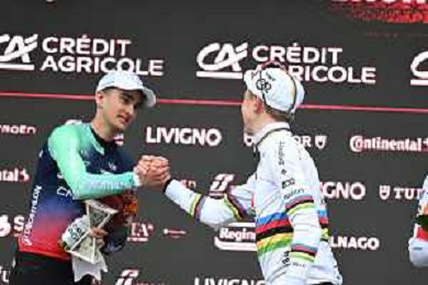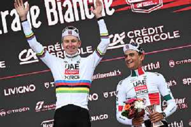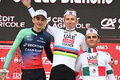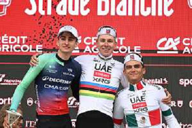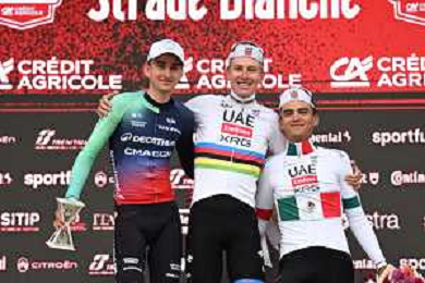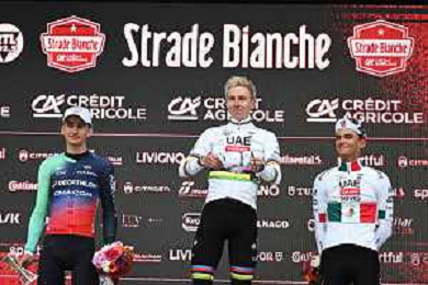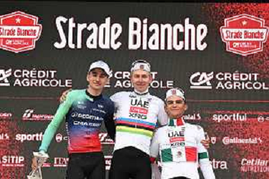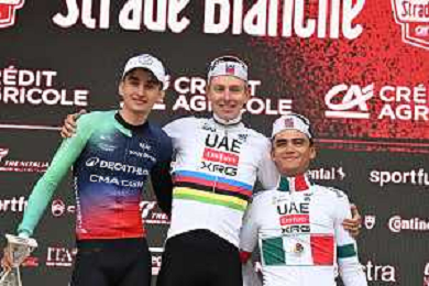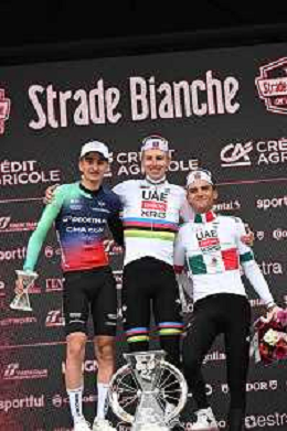 07-03-2026 Strade Bianche; 2026, Uae Emirates - Xrg; 2026, Decathlon - Cma Cgm; Pogacar, Tadej; Seixas, Paul; Del Toro Romero, Isaac; Siena; ©SIROTTI - AGENZIA ALDO LIVERANI SAS