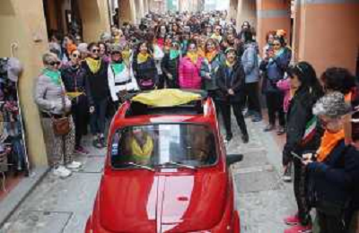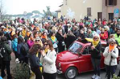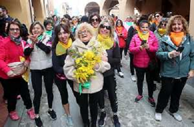 DOZZA(TOSCANELLA) 08 03 2026 STRADOZZA, la camminata benefica promossa dalla Pro Loco di Dozza e dedicata alle donne. Le donazioni raccolte saranno devolute allíAusl di Imola per contribuire a sostenere i costi del mammografo per lo screening NELLA FOTO RINA SPERINDIO STORICA ORGANIZZATRICE DELLA MANIFESTAZIONE STRADOZZA RICEVE LE MIMOSE PRIMA DELLA PARTENZA ©SANNA - AGENZIA ALDO LIVERANI SAS