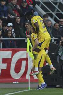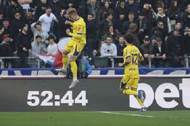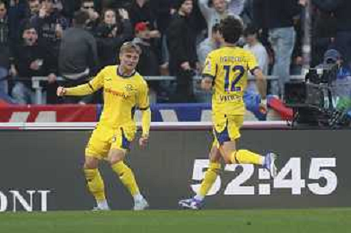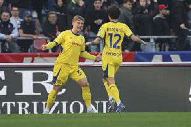 Martin Frese of Hellas Verona FC celebrates with team mate during Bologna FC vs Hellas Verona, 28° Serie A Enilive 2025-26 game at Renato Dall'Ara stadium in Bologna (BO), Italy, on March 08, 2026. (Photo by Davide Casentini)- AGENZIA ALDO LIVERANI SAS